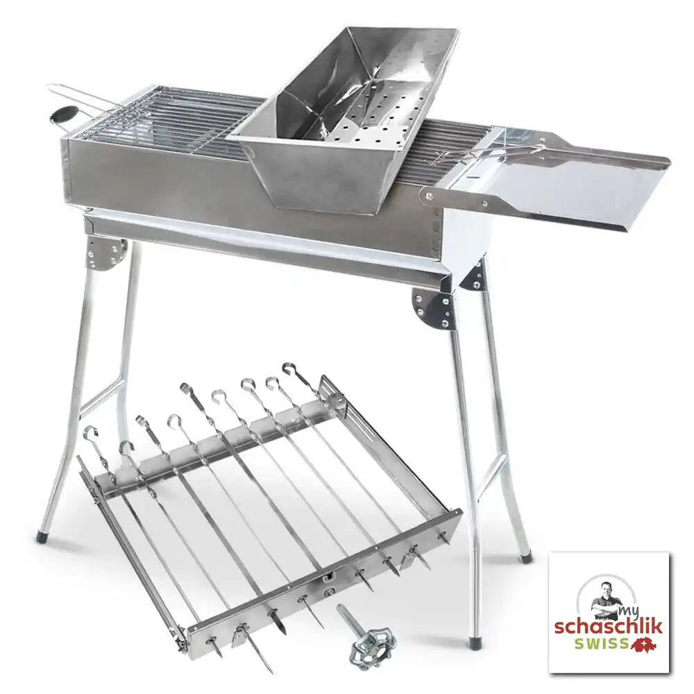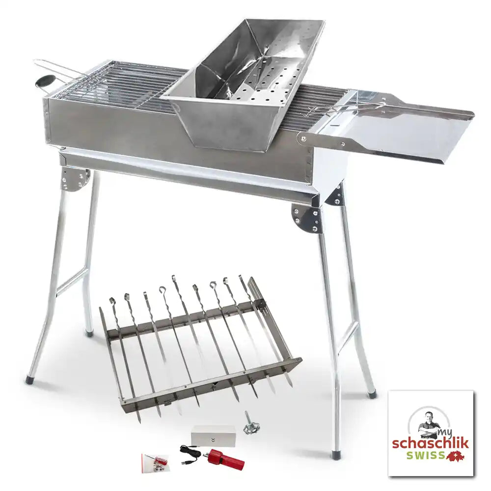 Schaschlik-Grills - z.B. Mangal "President" Premium Schaschlik Grill: Hochwertiger Grill aus rostfreiem Edelstahl mit klappbaren Füssen für Stabilität und einfache Lagerung. Inklusive Drehspiess-Aufsatz für 9. Spiesse. Oder den Mangal Schaschlik Grill "Kubik": Robuster Grill aus Edelstahl, der gleichmässige Hitzeverteilung und perfekte Grillergebnisse garantiert. Ideal für Schaschlik und andere Grillgerichte wie Gemüse, Fisch und Fleisch.