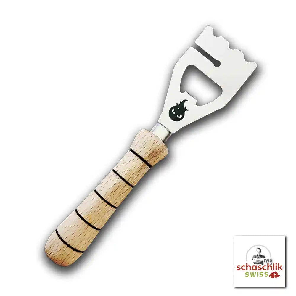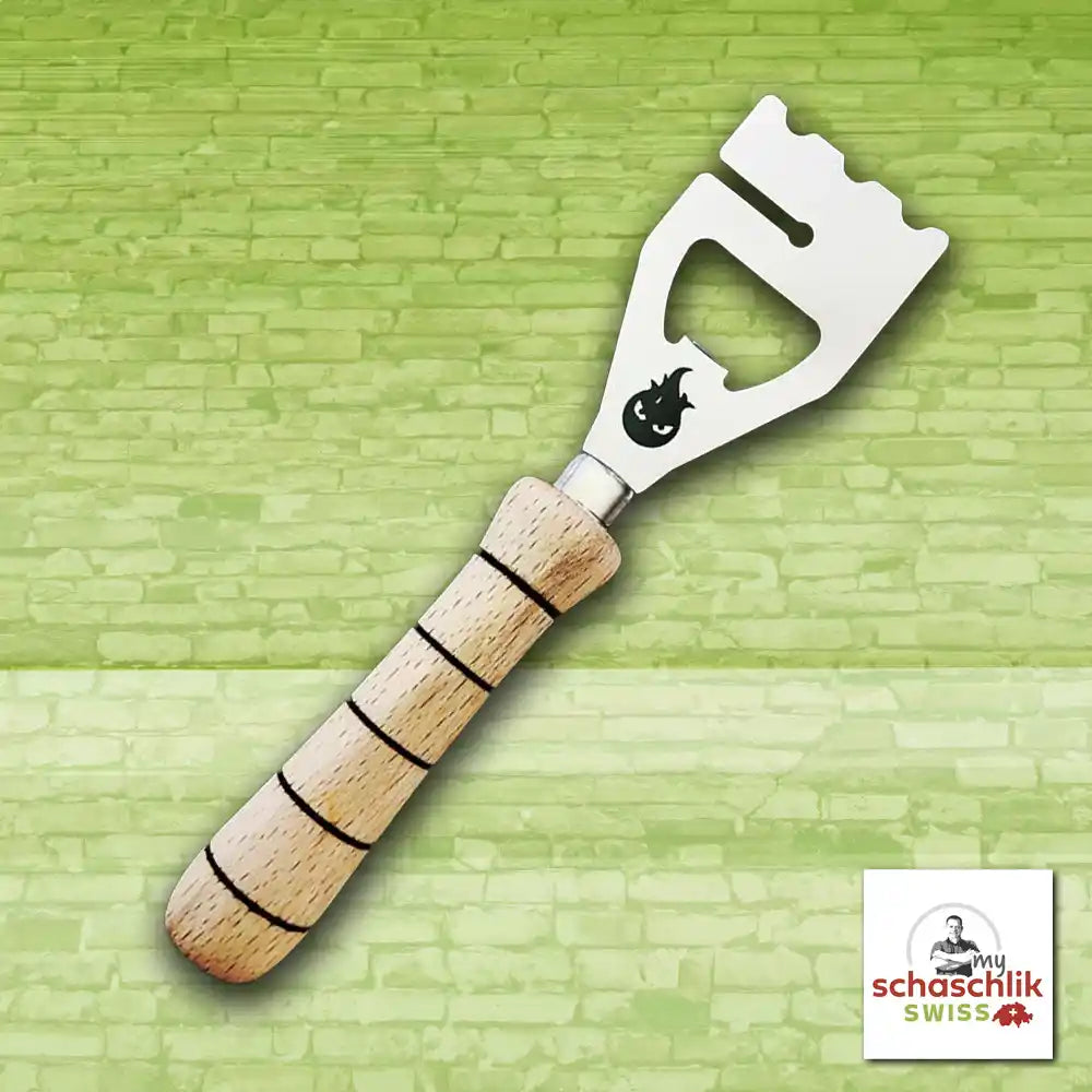 Grillhalter - z.B. Schaschlik-Spiesshalter von Aganjok: Hergestellt aus robustem Edelstahl, dieser Halter sorgt für die perfekte Anordnung der Spiesse und ermöglicht eine gleichmässige Garung. Zusätzlich dient er als praktischer 6er Bierträger mit integriertem Flaschenöffner, ideal für Garten und Camping.